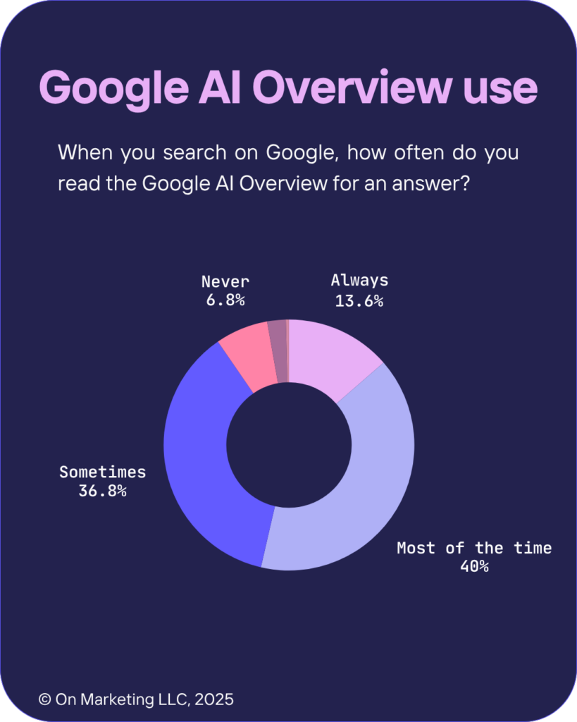 A total of 90.4% of our respondents read Google AI Overviews at least sometimes (36.8%), most of the time (40%), or always (13.6%).